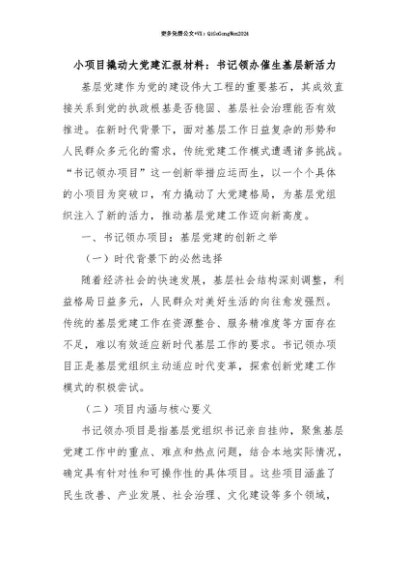 【七哥公文】2025年:【七哥公文】小项目撬动大党建汇报材料:书记领办催生基层新活力+更多免费公文+VX:QiGeGongWen2024+更多免费公文+VX:QiGeGongWen2024