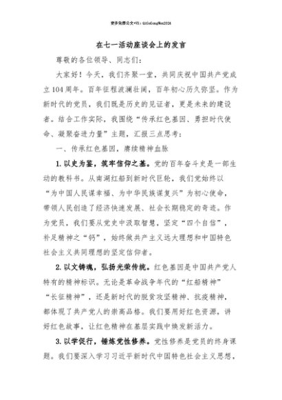 【七哥公文】2025年:【七哥公文】在七一活动座谈会上的发言+更多免费公文+VX:QiGeGongWen2024+更多免费公文+VX:QiGeGongWen2024