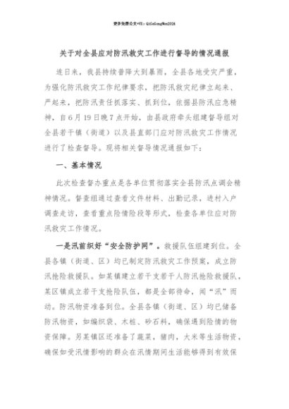 【七哥公文】2025年:【七哥公文】关于对全县应对防汛救灾工作进行督导的情况通报+更多免费公文+VX:QiGeGongWen2024+更多免费公文+VX:QiGeGongWen2024