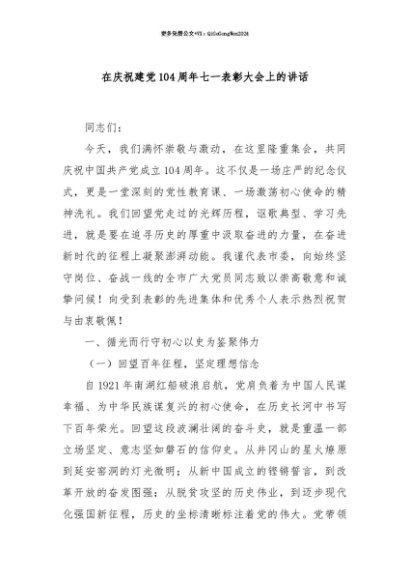 【七哥公文】2025年:【七哥公文】在庆祝建党104周年七一表彰大会上的讲话+更多免费公文+VX:QiGeGongWen2024+更多免费公文+VX:QiGeGongWen2024