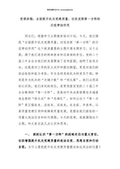【七哥公文】2025年:【七哥公文】党课讲稿:全面提升机关党建质量,切实发挥第一方阵的示范带动作用+更多免费公文+VX:QiGeGongWen2024+更多免费公文+VX:QiGeGongWen2024