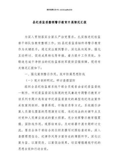【七哥公文】2025年:【七哥公文】县纪委监委整顿警示教育开展情况汇报+更多免费公文+VX:QiGeGongWen2024+更多免费公文+VX:QiGeGongWen2024
