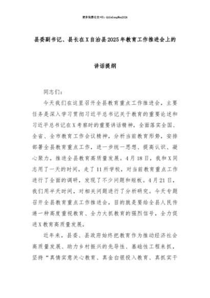 【七哥公文】2025年:【七哥公文】县委副书记、县长在X自治县2025年教育工作推进会上的讲话提纲+更多免费公文+VX:QiGeGongWen2024+更多免费公文+VX:QiGeGongWen2024