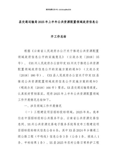 【七哥公文】2025年:【七哥公文】县交通运输局2025年上半年公共资源配置领域政府信息公开工作总结+更多免费公文+VX:QiGeGongWen2024+更多免费公文+VX:QiGeGongWen2024