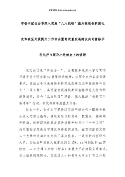 【七哥公文】2025年:【七哥公文】市委书记在全市深入实施“八八战略”强力推进创新深化改革攻坚开放提升工作例会暨高质量发展建设共同富裕示范先行市领导小组例会上的讲话+更多免费公文+VX:QiGeGongWen2024+更多免费公文+VX:QiGeGongWen2024