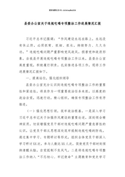 【七哥公文】2025年:【七哥公文】县委办公室关于违规吃喝专项整治工作进展情况汇报+更多免费公文+VX:QiGeGongWen2024+更多免费公文+VX:QiGeGongWen2024