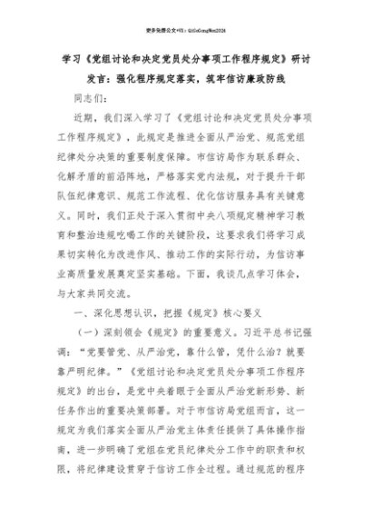 【七哥公文】2025年:【七哥公文】学习《党组讨论和决定党员处分事项工作程序规定》研讨发言:强化程序规定落实,筑牢信访廉政防线+更多免费公文+VX:QiGeGongWen2024+更多免费公文+VX:QiGeGongWen2024