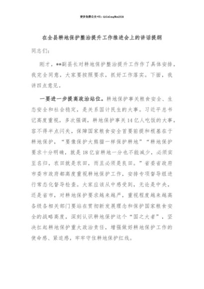 【七哥公文】2025年:【七哥公文】在全县耕地保护整治提升工作推进会上的讲话提纲+更多免费公文+VX:QiGeGongWen2024+更多免费公文+VX:QiGeGongWen2024