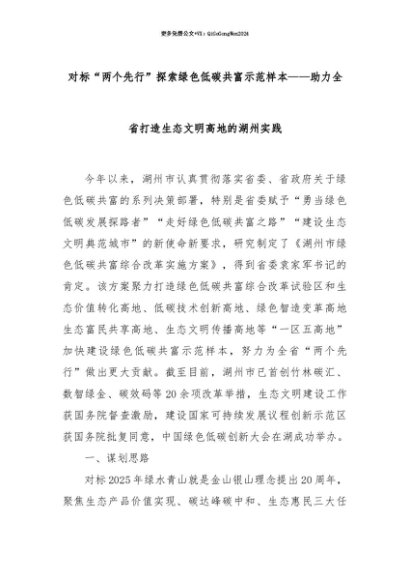 【七哥公文】2025年:【七哥公文】对标“两个先行”探索绿色低碳共富示范样本——助力全省打造生态文明高地的湖州实践+更多免费公文+VX:QiGeGongWen2024+更多免费公文+VX:QiGeGongWen2024