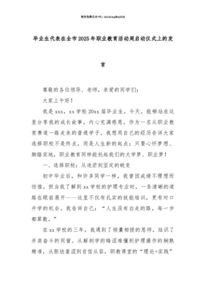 【七哥公文】2025年:【七哥公文】毕业生代表在全市2025年职业教育活动周启动仪式上的发言+更多免费公文+VX:QiGeGongWen2024+更多免费公文+VX:QiGeGongWen2024