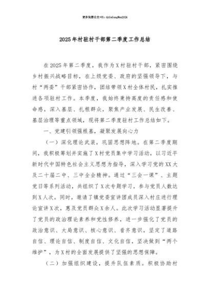 【七哥公文】2025年:【七哥公文】2025年村驻村干部第二季度工作总结+更多免费公文+VX:QiGeGongWen2024+更多免费公文+VX:QiGeGongWen2024