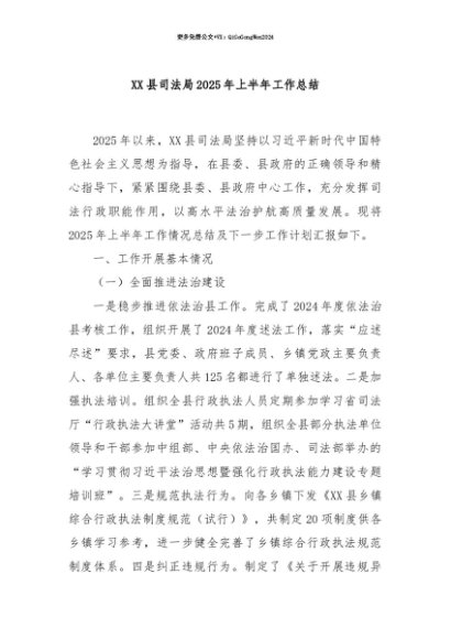 【七哥公文】2025年:【七哥公文】XX县司法局2025年上半年工作总结+更多免费公文+VX:QiGeGongWen2024+更多免费公文+VX:QiGeGongWen2024
