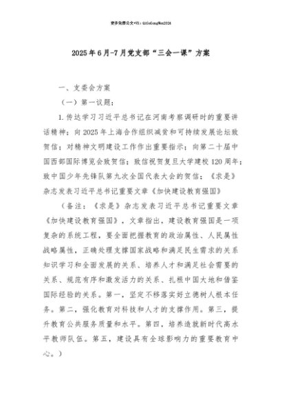 【七哥公文】2025年:【七哥公文】2025年6月-7月党支部“三会一课”方案+更多免费公文+VX:QiGeGongWen2024+更多免费公文+VX:QiGeGongWen2024