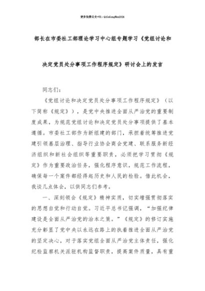 【七哥公文】2025年:【七哥公文】部长在市委社工部理论学习中心组专题学习《党组讨论和决定党员处分事项工作程序规定》研讨会上的发言+更多免费公文+VX:QiGeGongWen2024+更多免费公文+VX:QiGeGongWen2024