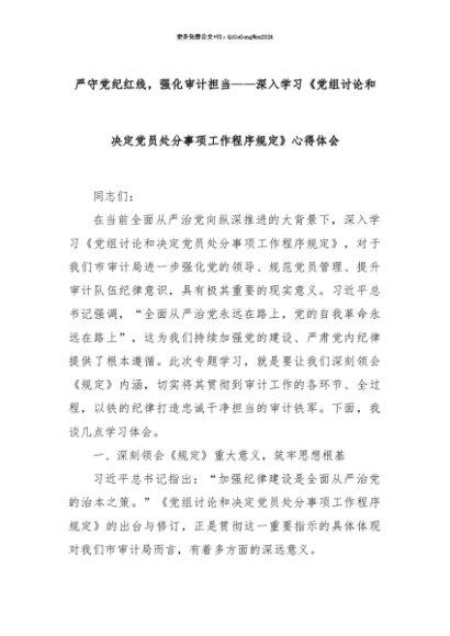 【七哥公文】2025年:【七哥公文】严守党纪红线,强化审计担当——深入学习《党组讨论和决定党员处分事项工作程序规定》心得体会+更多免费公文+VX:QiGeGongWen2024+更多免费公文+VX:QiGeGongWen2024