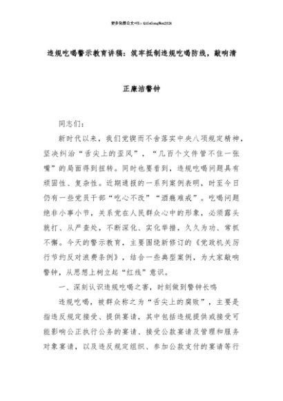 【七哥公文】2025年:【七哥公文】违规吃喝警示教育讲稿:筑牢抵制违规吃喝防线,敲响清正廉洁警钟+更多免费公文+VX:QiGeGongWen2024+更多免费公文+VX:QiGeGongWen2024