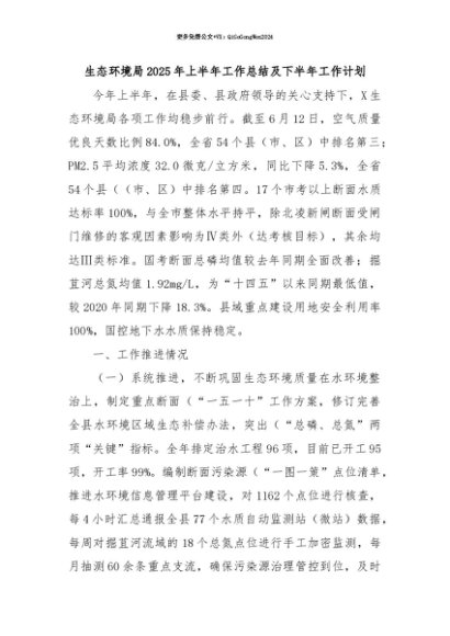 【七哥公文】2025年:【七哥公文】生态环境局2025年上半年工作总结及下半年工作计划+更多免费公文+VX:QiGeGongWen2024+更多免费公文+VX:QiGeGongWen2024