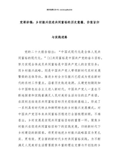 【七哥公文】2025年:【七哥公文】党课讲稿:乡村振兴促进共同富裕的历史意蕴、价值旨归与实践进路+更多免费公文+VX:QiGeGongWen2024+更多免费公文+VX:QiGeGongWen2024