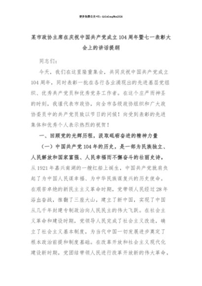 【七哥公文】2025年:【七哥公文】某市政协主席在庆祝中国共产党成立104周年暨七一表彰大会上的讲话提纲+更多免费公文+VX:QiGeGongWen2024+更多免费公文+VX:QiGeGongWen2024