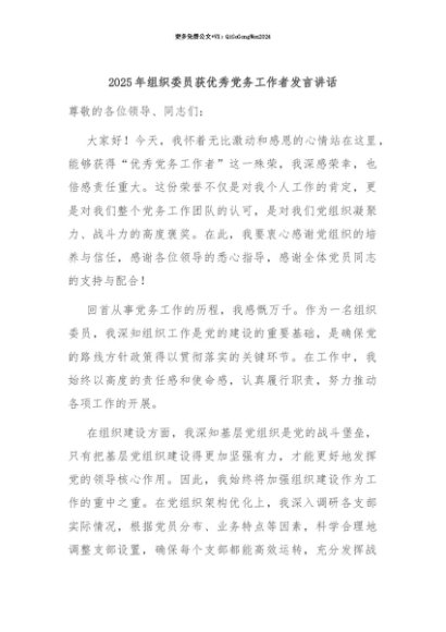 【七哥公文】2025年:【七哥公文】2025年组织委员获优秀党务工作者发言讲话+更多免费公文+VX:QiGeGongWen2024+更多免费公文+VX:QiGeGongWen2024