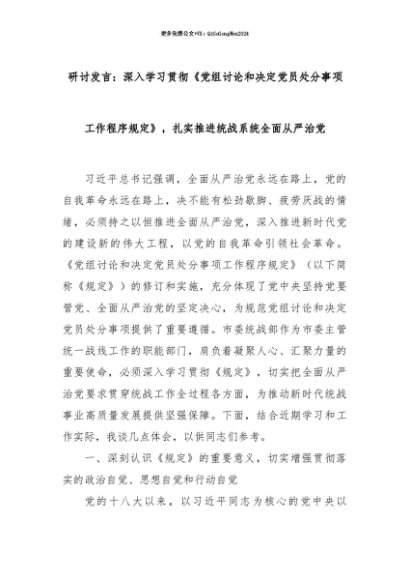 【七哥公文】2025年:【七哥公文】研讨发言:深入学习贯彻《党组讨论和决定党员处分事项工作程序规定》,扎实推进统战系统全面从严治党+更多免费公文+VX:QiGeGongWen2024+更多免费公文+VX:QiGeGongWen2024