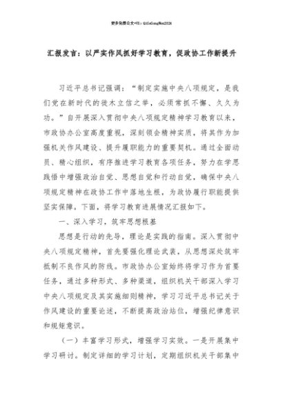 【七哥公文】2025年:【七哥公文】汇报发言:以严实作风抓好学习教育,促政协工作新提升+更多免费公文+VX:QiGeGongWen2024+更多免费公文+VX:QiGeGongWen2024