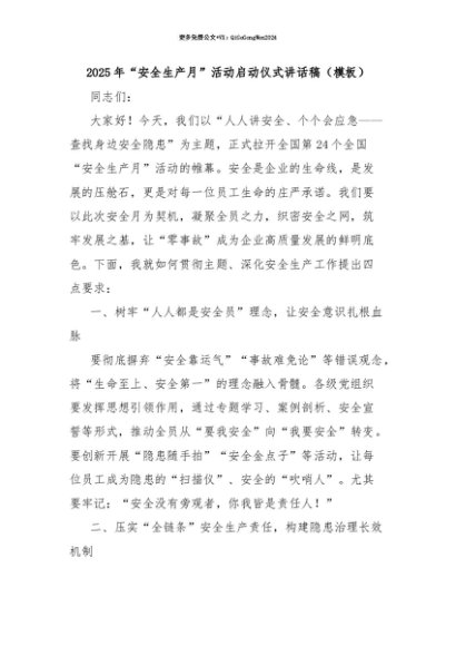 【七哥公文】2025年:【七哥公文】2025年“安全生产月”活动启动仪式讲话稿(模板)+更多免费公文+VX:QiGeGongWen2024+更多免费公文+VX:QiGeGongWen2024