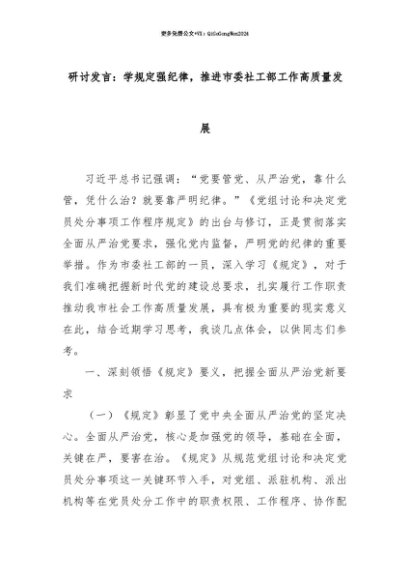 【七哥公文】2025年:【七哥公文】研讨发言:学规定强纪律,推进市委社工部工作高质量发展+更多免费公文+VX:QiGeGongWen2024+更多免费公文+VX:QiGeGongWen2024