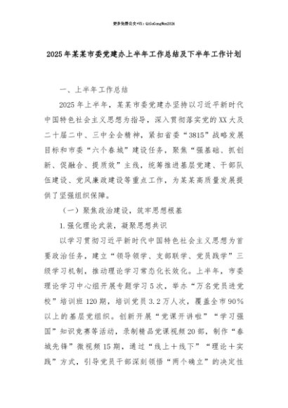 【七哥公文】2025年:【七哥公文】2025年某某市委党建办上半年工作总结及下半年工作计划+更多免费公文+VX:QiGeGongWen2024+更多免费公文+VX:QiGeGongWen2024