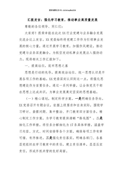 【七哥公文】2025年:【七哥公文】汇报发言:强化学习教育,推动事业高质量发展+更多免费公文+VX:QiGeGongWen2024+更多免费公文+VX:QiGeGongWen2024