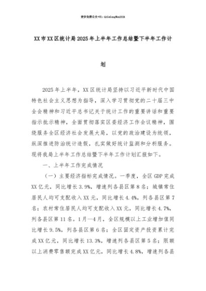 【七哥公文】2025年:【七哥公文】XX市XX区统计局2025年上半年工作总结暨下半年工作计划+更多免费公文+VX:QiGeGongWen2024+更多免费公文+VX:QiGeGongWen2024