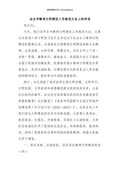 【七哥公文】2025年:【七哥公文】在全市精神文明建设工作推进大会上的讲话+更多免费公文+VX:QiGeGongWen2024+更多免费公文+VX:QiGeGongWen2024