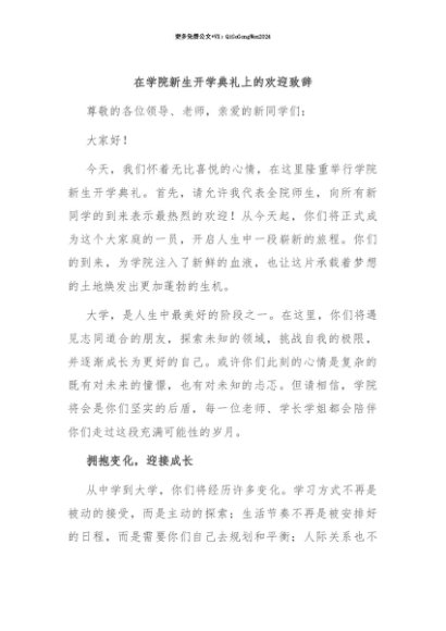 【七哥公文】2025年:【七哥公文】在学院新生开学典礼上的欢迎致辞+更多免费公文+VX:QiGeGongWen2024+更多免费公文+VX:QiGeGongWen2024