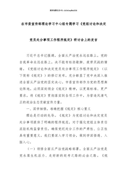 【七哥公文】2025年:【七哥公文】在市委宣传部理论学习中心组专题学习《党组讨论和决定党员处分事项工作程序规定》研讨会上的发言+更多免费公文+VX:QiGeGongWen2024+更多免费公文+VX:QiGeGongWen2024