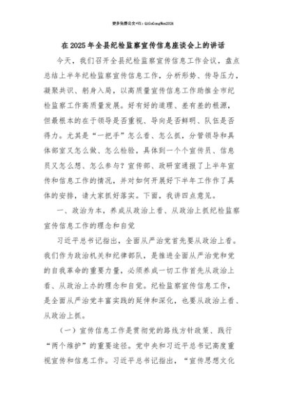 【七哥公文】2025年:【七哥公文】在2025年全县纪检监察宣传信息座谈会上的讲话+更多免费公文+VX:QiGeGongWen2024+更多免费公文+VX:QiGeGongWen2024