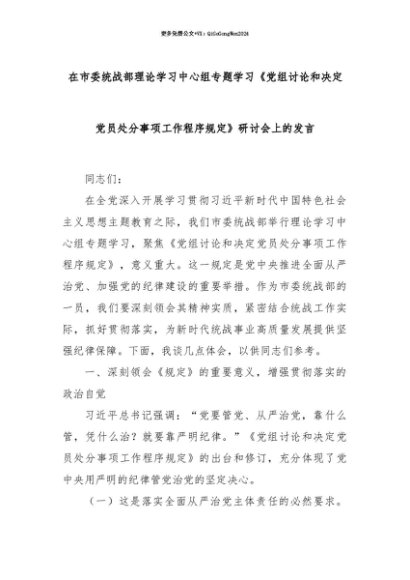 【七哥公文】2025年:【七哥公文】在市委统战部理论学习中心组专题学习《党组讨论和决定党员处分事项工作程序规定》研讨会上的发言+更多免费公文+VX:QiGeGongWen2024+更多免费公文+VX:QiGeGongWen2024