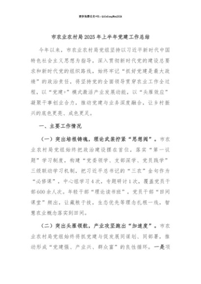 【七哥公文】2025年:【七哥公文】市农业农村局2025年上半年党建工作总结+更多免费公文+VX:QiGeGongWen2024+更多免费公文+VX:QiGeGongWen2024
