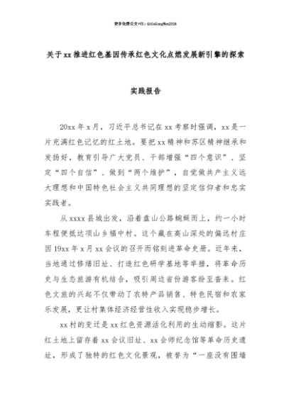 【七哥公文】2025年:【七哥公文】关于xx推进红色基因传承红色文化点燃发展新引擎的探索实践报告+更多免费公文+VX:QiGeGongWen2024+更多免费公文+VX:QiGeGongWen2024