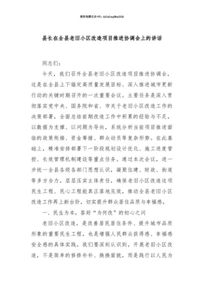 【七哥公文】2025年:【七哥公文】县长在全县老旧小区改造项目推进协调会上的讲话+更多免费公文+VX:QiGeGongWen2024+更多免费公文+VX:QiGeGongWen2024