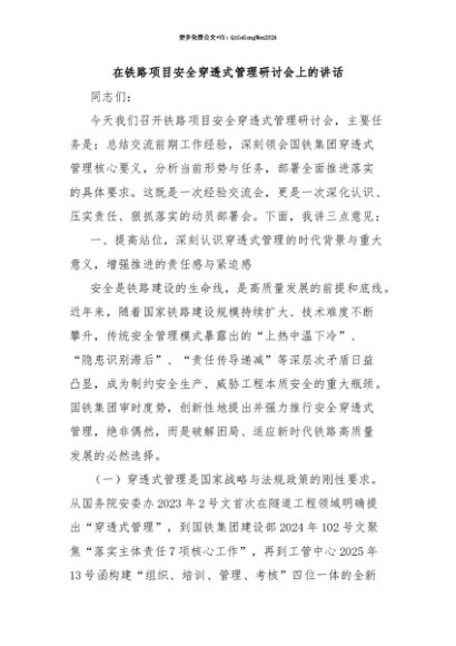 【七哥公文】2025年:【七哥公文】在铁路项目安全穿透式管理研讨会上的讲话+更多免费公文+VX:QiGeGongWen2024+更多免费公文+VX:QiGeGongWen2024