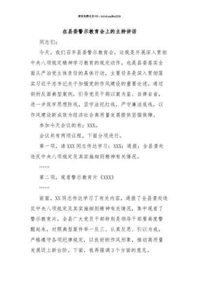 【七哥公文】2025年:【七哥公文】在县委警示教育会上的主持讲话+更多免费公文+VX:QiGeGongWen2024+更多免费公文+VX:QiGeGongWen2024