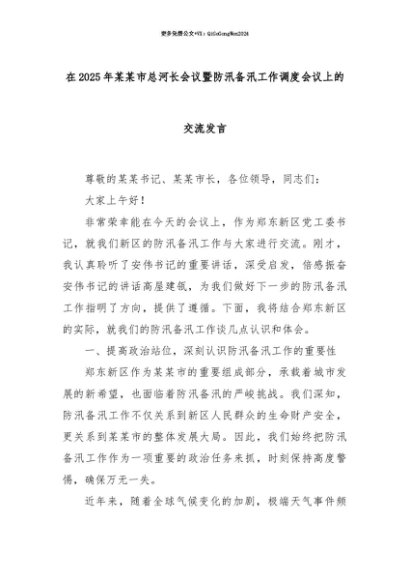 【七哥公文】2025年:【七哥公文】在2025年某某市总河长会议暨防汛备汛工作调度会议上的交流发言+更多免费公文+VX:QiGeGongWen2024+更多免费公文+VX:QiGeGongWen2024