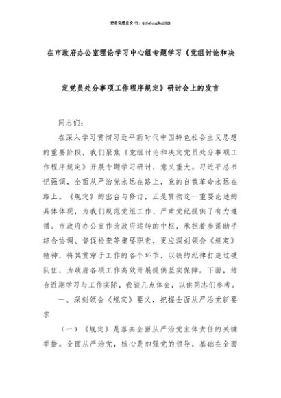 【七哥公文】2025年:【七哥公文】在市政府办公室理论学习中心组专题学习《党组讨论和决定党员处分事项工作程序规定》研讨会上的发言+更多免费公文+VX:QiGeGongWen2024+更多免费公文+VX:QiGeGongWen2024