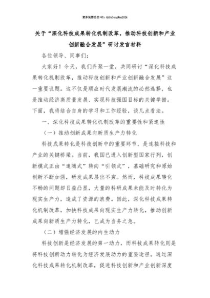 【七哥公文】2025年:【七哥公文】关于“深化科技成果转化机制改革,推动科技创新和产业创新融合发展”研讨发言材料+更多免费公文+VX:QiGeGongWen2024+更多免费公文+VX:QiGeGongWen2024