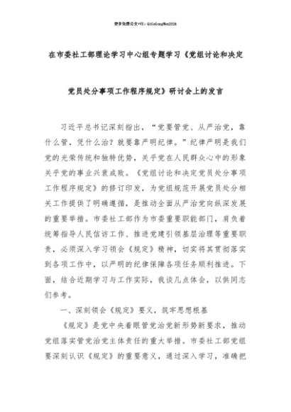 【七哥公文】2025年:【七哥公文】在市委社工部理论学习中心组专题学习《党组讨论和决定党员处分事项工作程序规定》研讨会上的发言+更多免费公文+VX:QiGeGongWen2024+更多免费公文+VX:QiGeGongWen2024