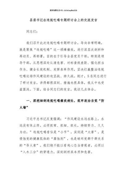 【七哥公文】2025年:【七哥公文】县委书记在违规吃喝专题研讨会上的交流发言+更多免费公文+VX:QiGeGongWen2024+更多免费公文+VX:QiGeGongWen2024