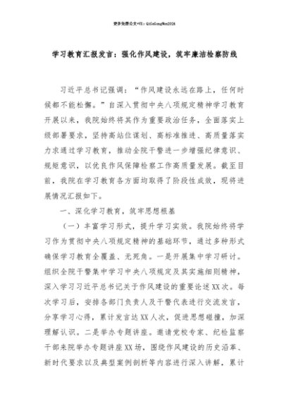 【七哥公文】2025年:【七哥公文】学习教育汇报发言:强化作风建设,筑牢廉洁检察防线+更多免费公文+VX:QiGeGongWen2024+更多免费公文+VX:QiGeGongWen2024