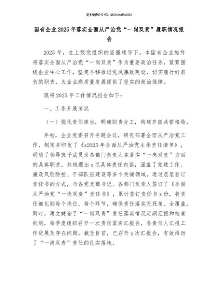 【七哥公文】2025年:【七哥公文】国有企业2025年落实全面从严治党“一岗双责”履职情况报告+更多免费公文+VX:QiGeGongWen2024+更多免费公文+VX:QiGeGongWen2024