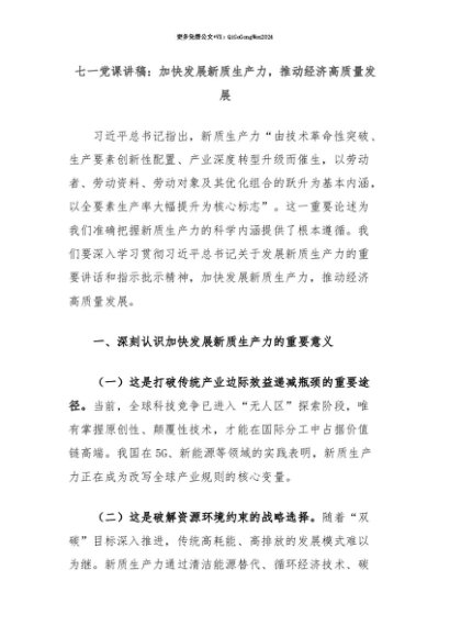 【七哥公文】2025年:【七哥公文】七一党课讲稿:加快发展新质生产力,推动经济高质量发展+更多免费公文+VX:QiGeGongWen2024+更多免费公文+VX:QiGeGongWen2024