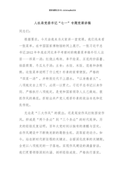 【七哥公文】2025年:【七哥公文】人社局党委书记“七一”专题党课讲稿+更多免费公文+VX:QiGeGongWen2024+更多免费公文+VX:QiGeGongWen2024